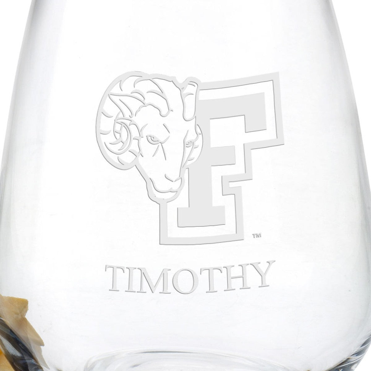 Contemporary Fordham University stemless wine glasses bring an elegant touch to your table or bar. The Fordham Logo is deep-etched on each glass.