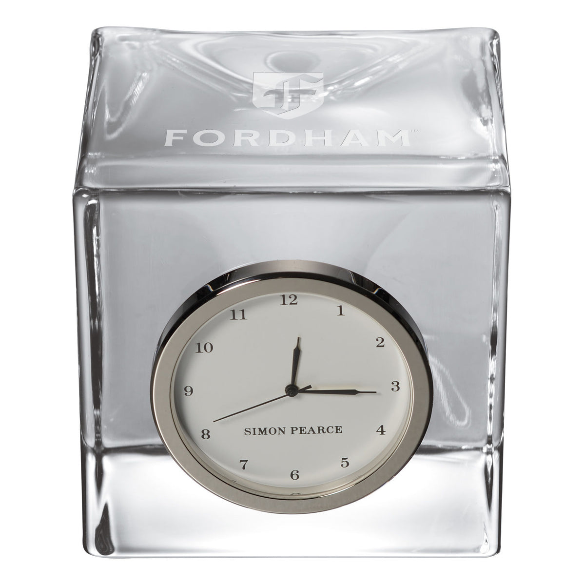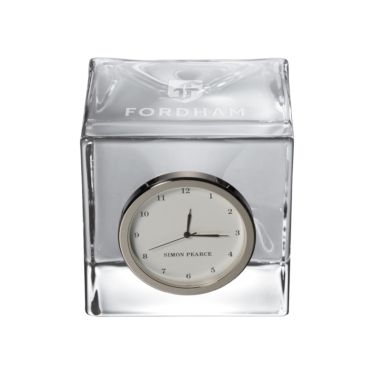 The Fordham University Glass Desk Clock is distinctly etched with the Fordham Logo, and is a great addition to any surface. The clock includes a traditional numbered face with a sweep hand to count the seconds.