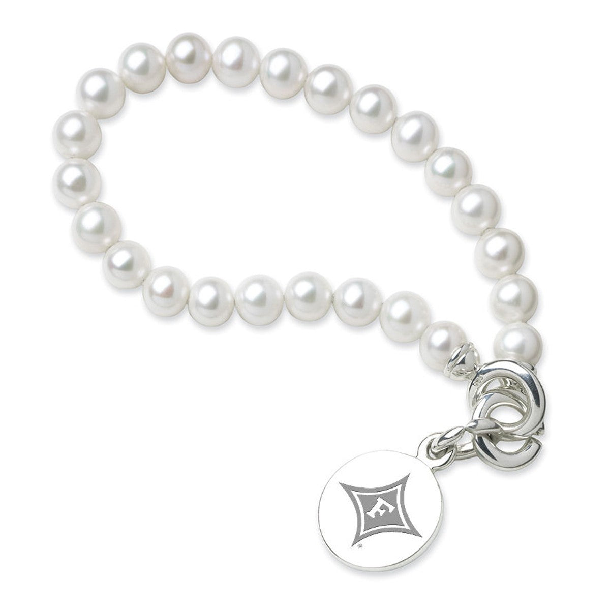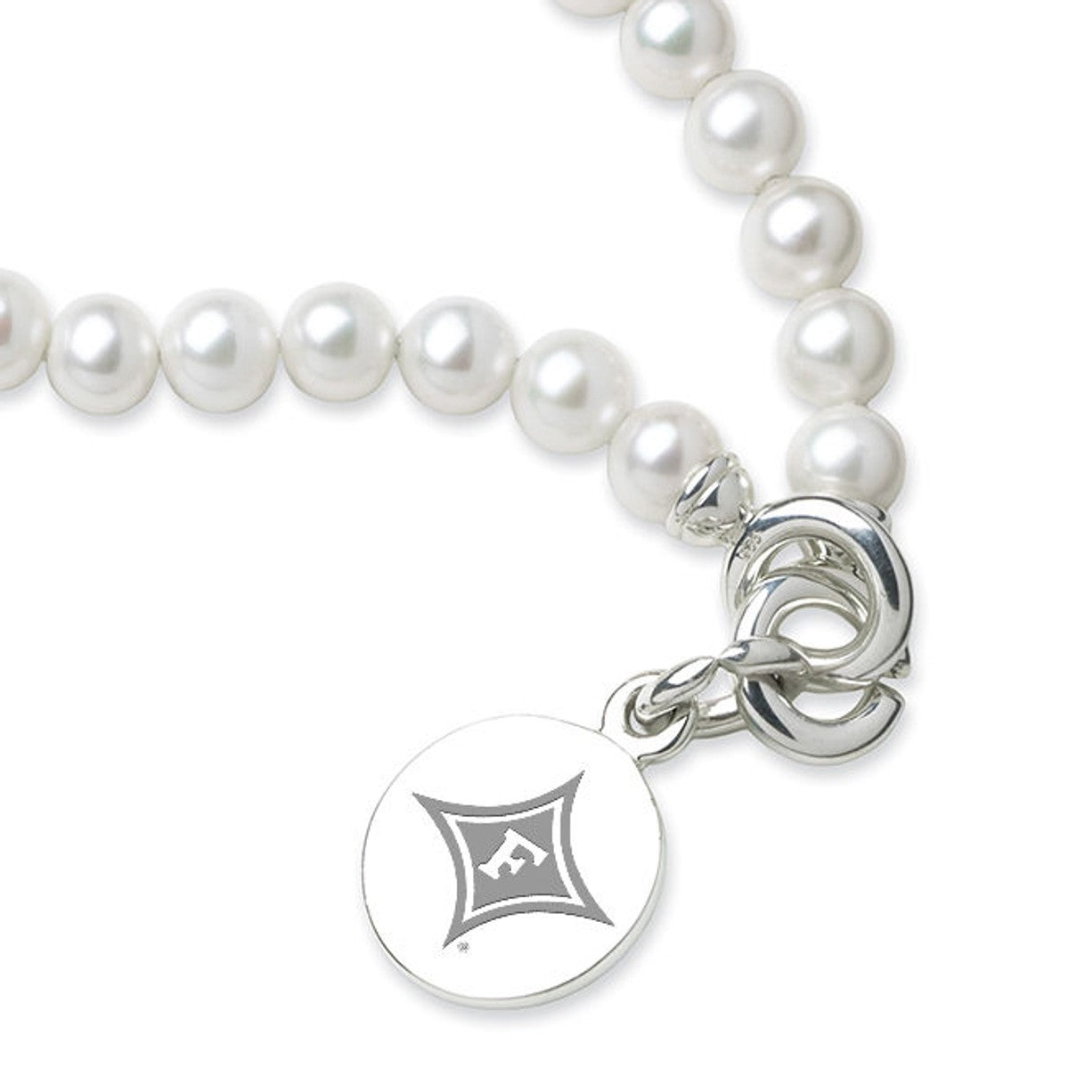 Furman University pearl bracelet and sterling silver Furman charm features the Furman Logo delicately engraved on front and interlocking "C" clasp.