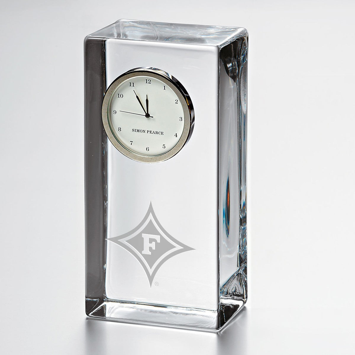 The Furman Tall Glass Desk Clock stands proudly on any surface, distinctly etched with the Furman Logo. The clock showcases a traditional numbered face with a sweep hand to count the seconds.