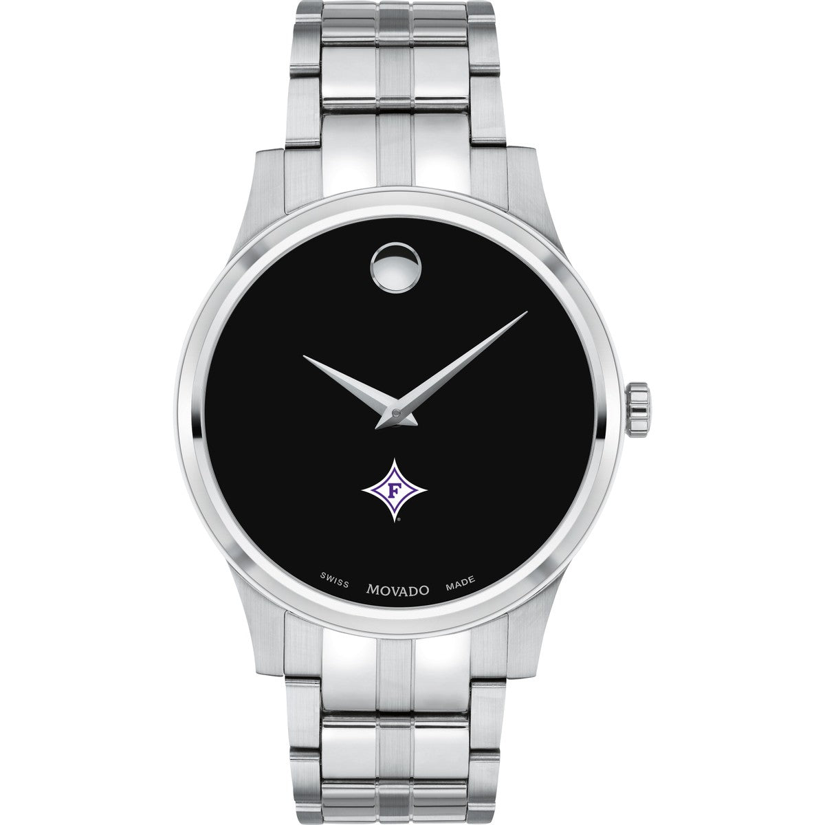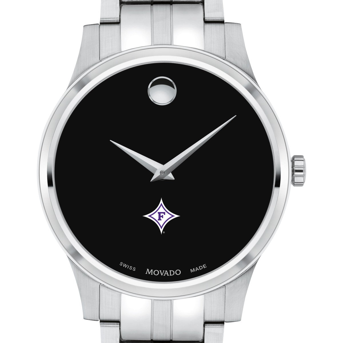 The Furman University Men's Movado Collection watch showcases the iconic Furman Logo in full color on a sophisticated black dial. This classic timepiece, featuring the renowned concave dot symbolizing the sun at high noon, has been a design masterpiece since its creation in 1947. Personalize your watch with free engraving without any delay to your order.