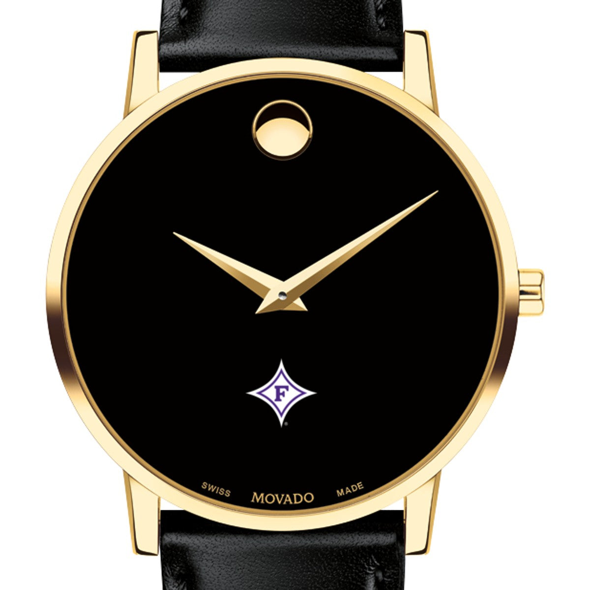 Furman University Men's Movado Museum watch features the Furman Logo in full color at 6 o'clock on black dial. Created in 1947, the iconic concave dot symbolizes the sun at high-noon. Complimentary personal engraving.