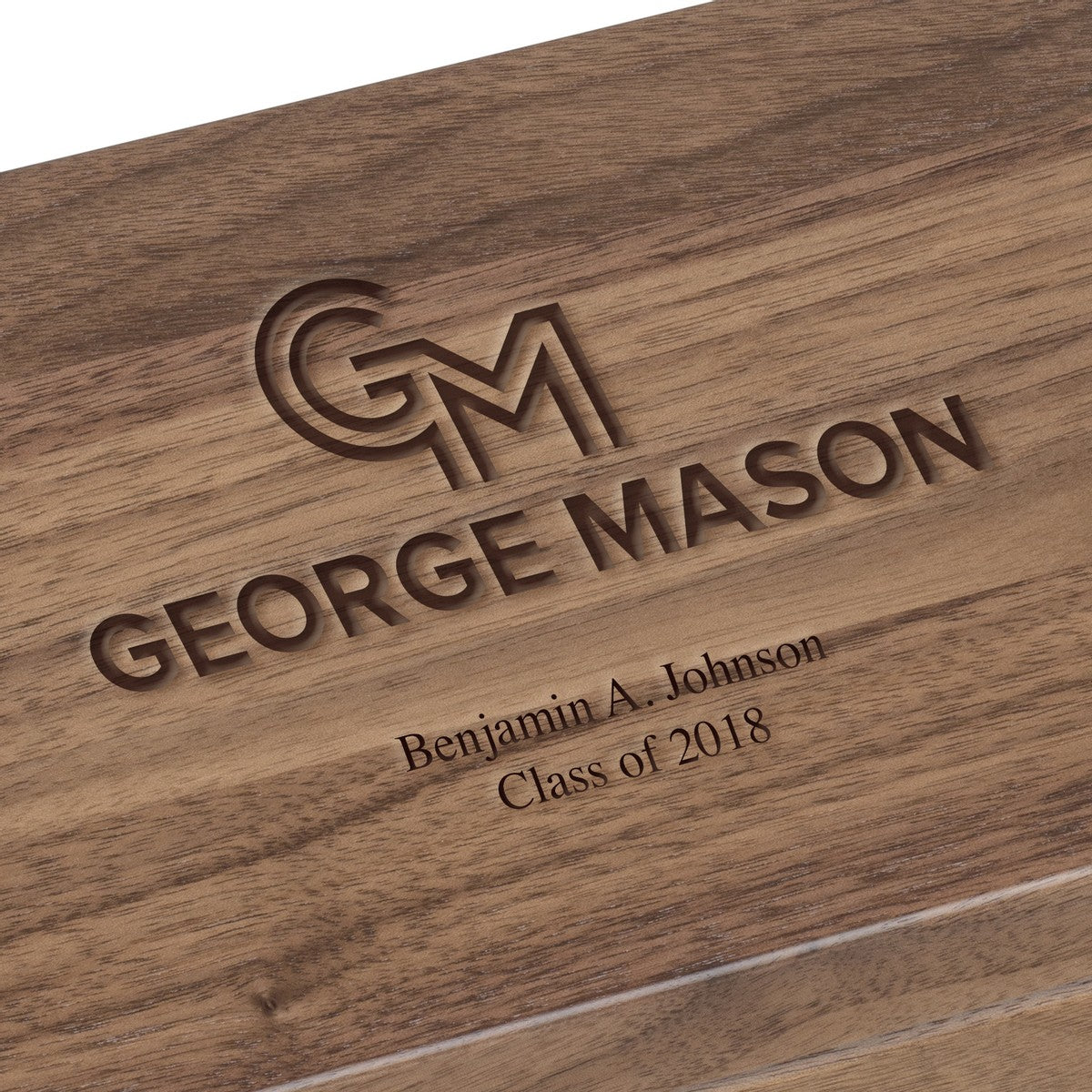 Constructed from premium hardwood, this wooden keepsake box showcases the natural beauty and warmth of the wood grain. Each box is crafted by skilled artisans, ensuring that no two are exactly alike. The lid features the official George Mason logo meticulously engraved and can be personalized with up to two lines of engraving, adding a touch of distinction to this already exceptional piece.