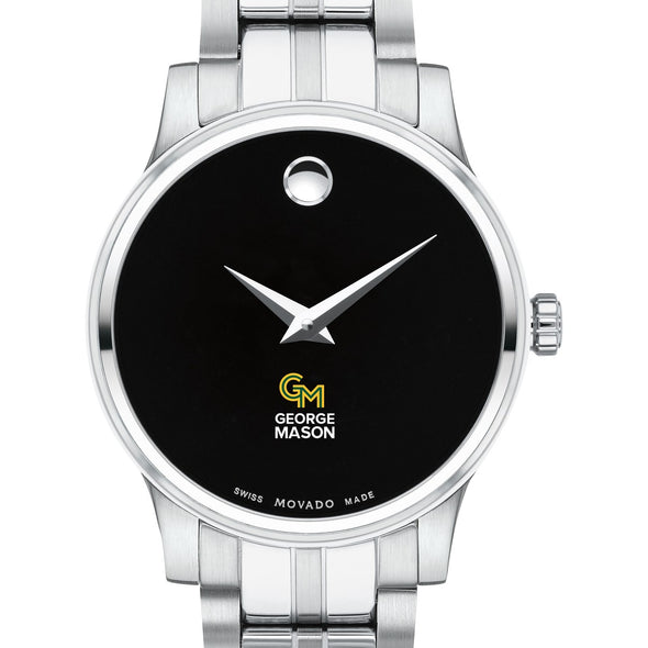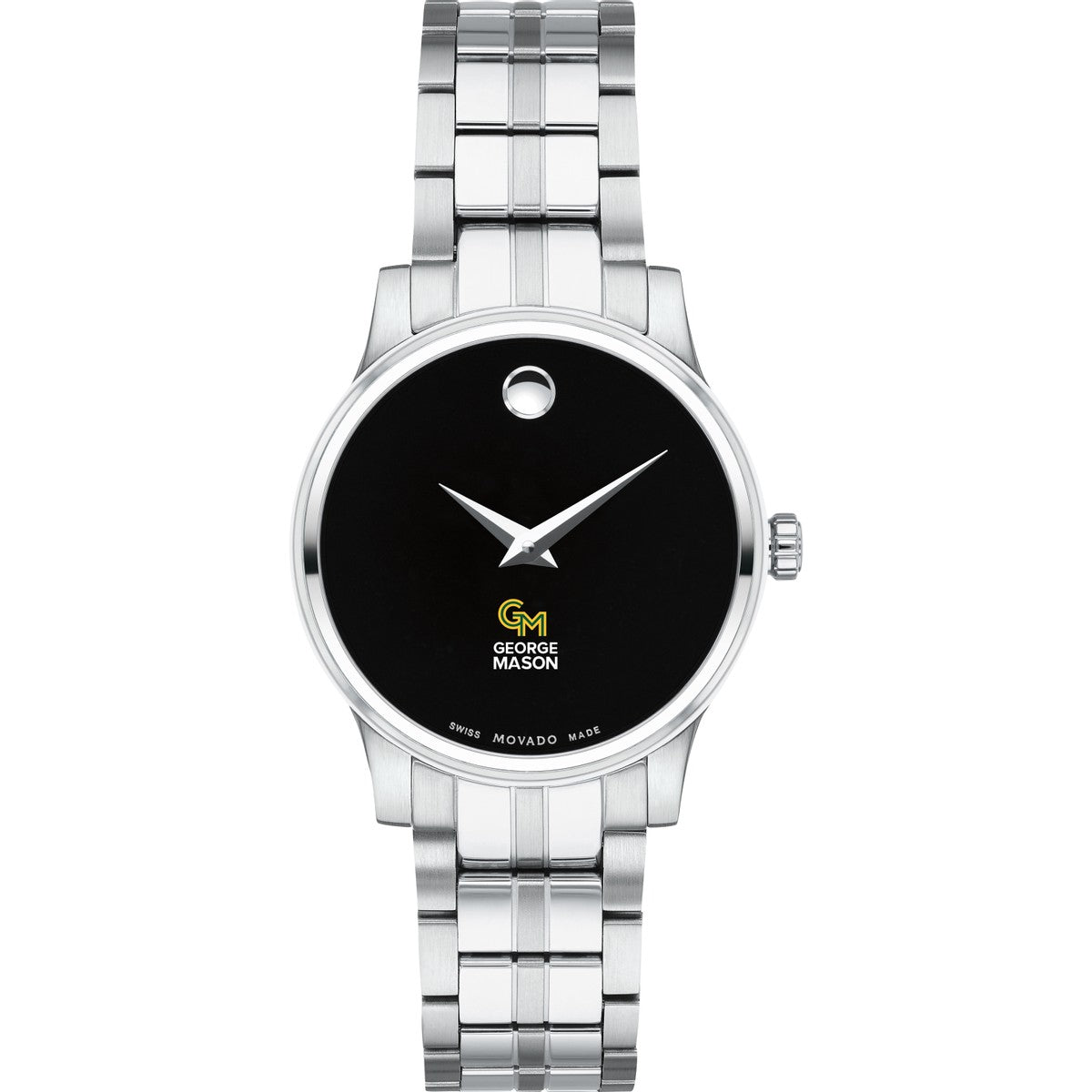 The George Mason University Women's Movado Collection watch showcases the iconic George Mason logo in full color against a sophisticated black dial. This elegant timepiece, featuring the renowned concave dot symbolizing the sun at high noon, embodies timeless style. Personalize your watch with free engraving without any delay to your order.