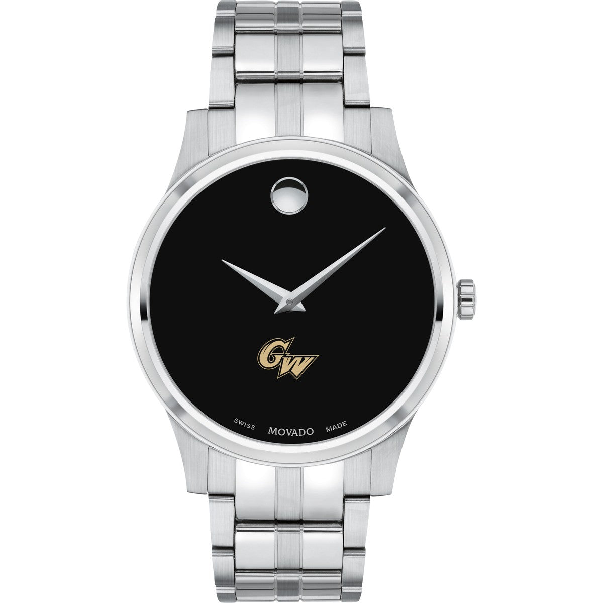The George Washington University Men's Movado Collection watch showcases the iconic George Washington Logo in full color on a sophisticated black dial. This classic timepiece, featuring the renowned concave dot symbolizing the sun at high noon, has been a design masterpiece since its creation in 1947. Personalize your watch with free engraving without any delay to your order.