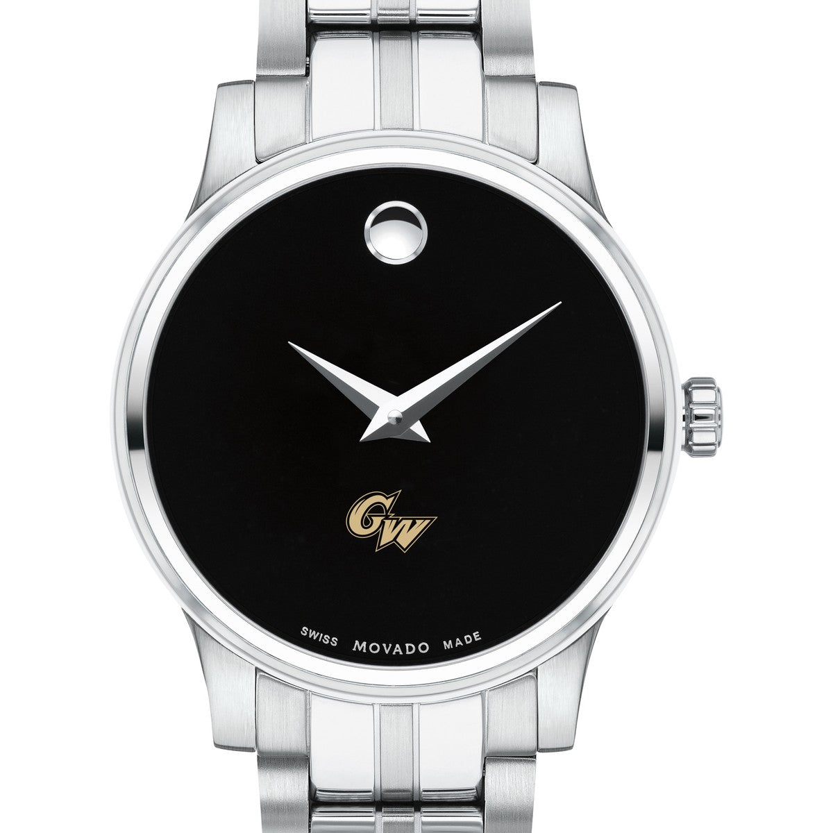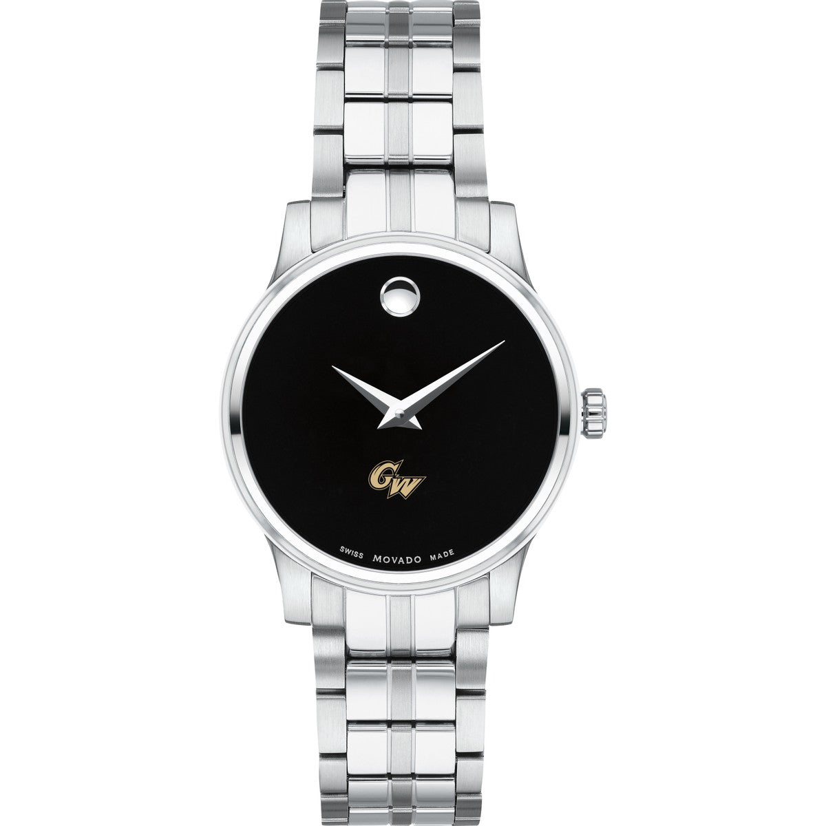 The George Washington University Women's Movado Collection watch showcases the iconic George Washington Logo in full color against a sophisticated black dial. This elegant timepiece, featuring the renowned concave dot symbolizing the sun at high noon, embodies timeless style. Personalize your watch with free engraving without any delay to your order.