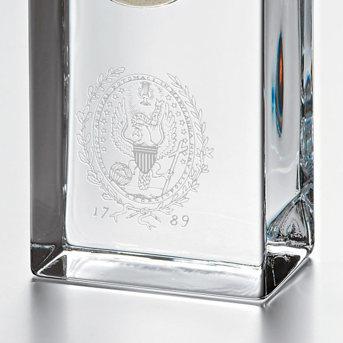 The Georgetown Tall Glass Desk Clock stands proudly on any surface, distinctly etched with the Georgetown Logo. The clock showcases a traditional numbered face with a sweep hand to count the seconds.