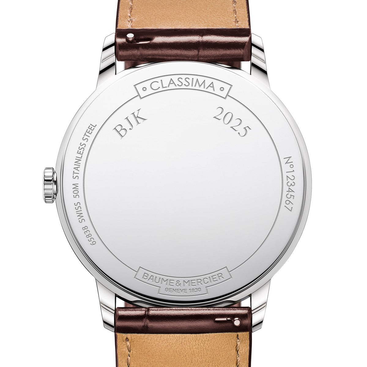 A masterpiece of Swiss craftsmanship, the Georgetown Men's Baume et Mercier 42mm Classima Watch features a silver sun-satin dial with the Georgetown logo, gilded hands, and a luxurious brown leather strap. This timepiece offers refined elegance for any occasion, making it the perfect statement piece for the modern gentleman. Complimentary personal engraving.