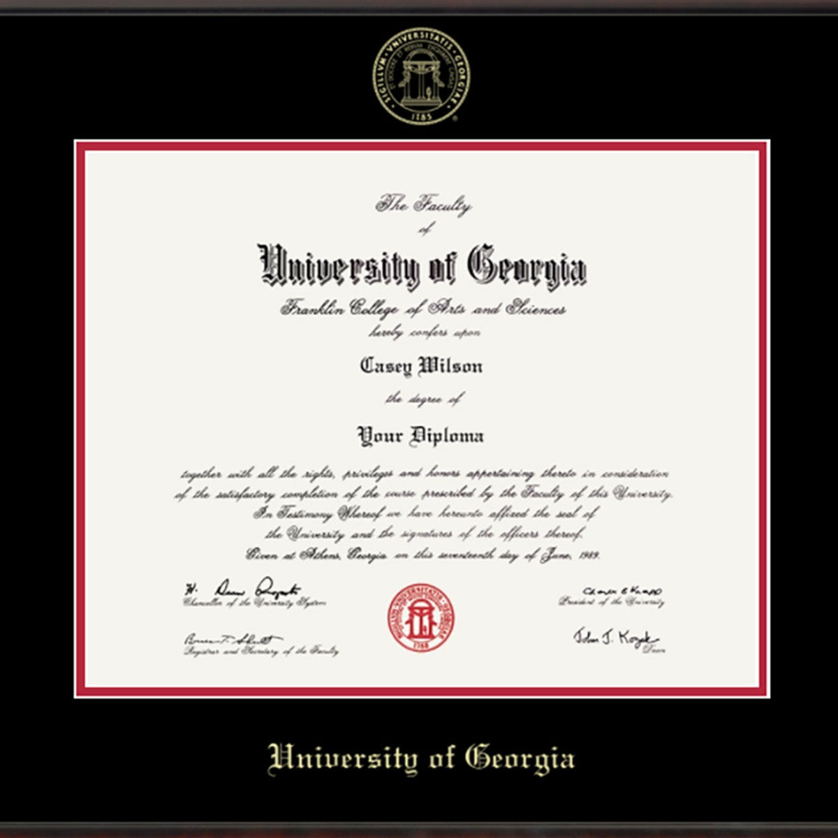 This University of Georgia diploma frame is crafted from solid wood in the USA. Proudly display your Georgia diploma with museum quality conservation mounting materials to showcase and protect your University of Georgia diploma.