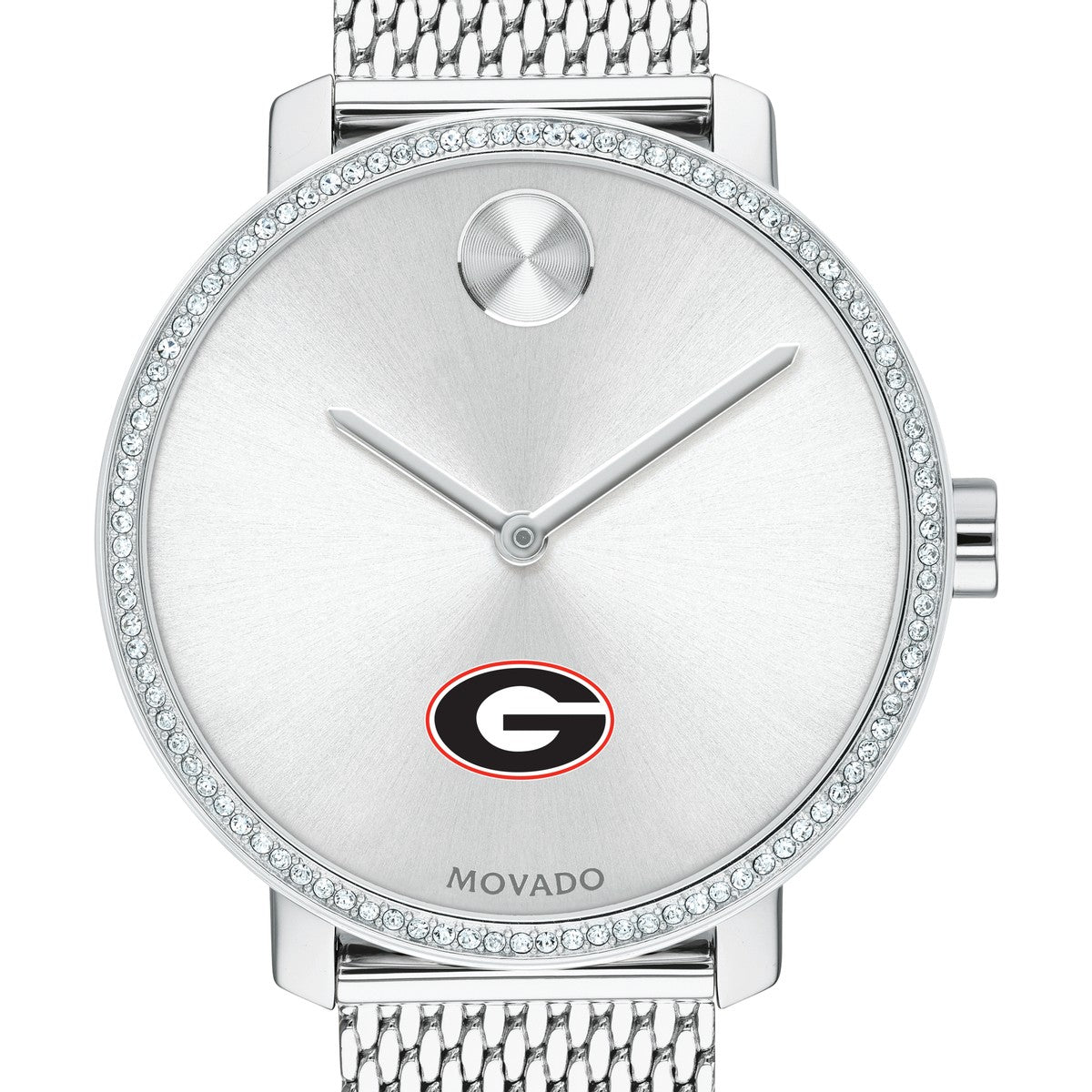 University of Georgia Women's Movado BOLD watch features the Georgia Logo in full color at 6 o'clock on silver sunray dial.