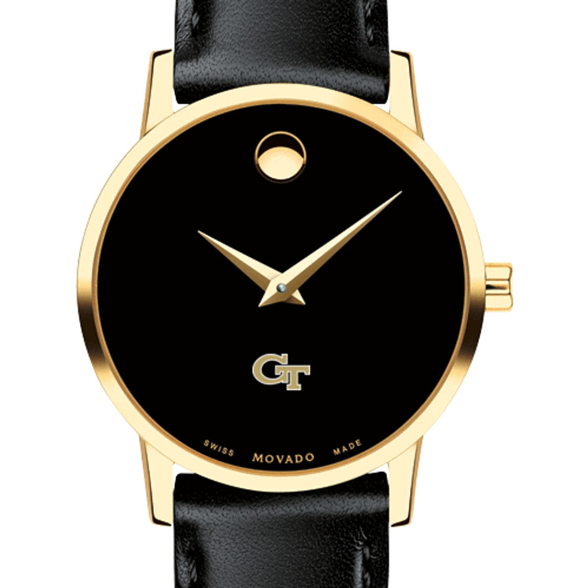 Georgia Tech Women's Movado Museum watch features the Georgia Tech Logo in full color at 6 o'clock on black dial. Created in 1947, the iconic concave dot symbolizes the sun at high-noon. Complimentary personal engraving.