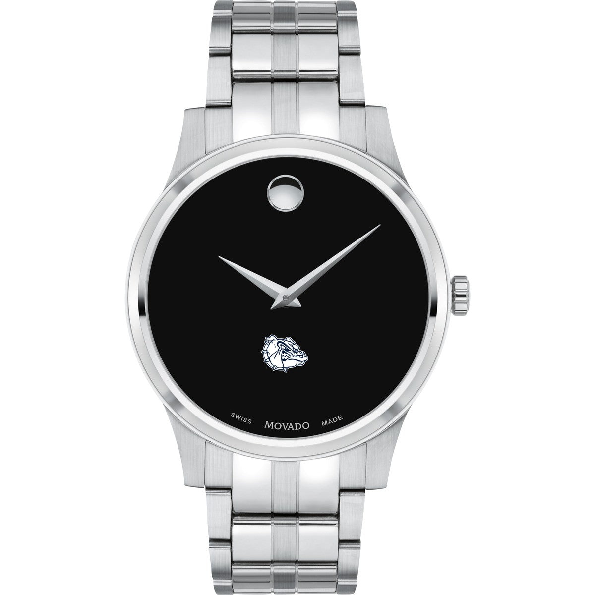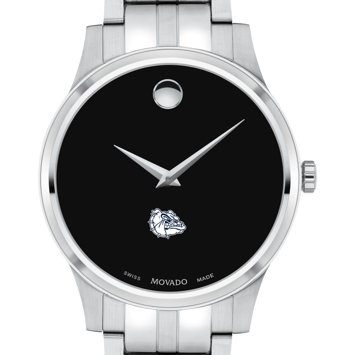 The Gonzaga University Men's Movado Collection watch showcases the iconic Gonzaga logo in full color on a sophisticated black dial. This classic timepiece, featuring the renowned concave dot symbolizing the sun at high noon, has been a design masterpiece since its creation in 1947. Personalize your watch with free engraving without any delay to your order.