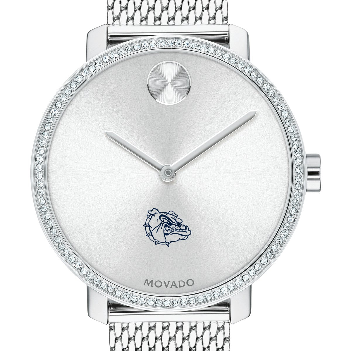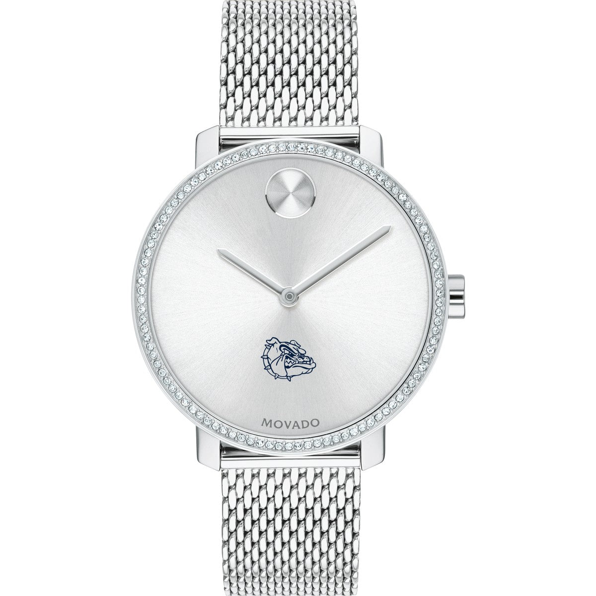 Gonzaga University Women's Movado BOLD watch features the Gonzaga logo in full color at 6 o'clock on silver sunray dial.