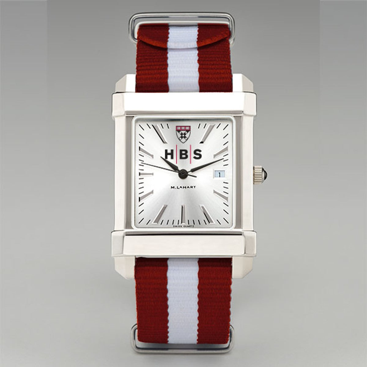 This Harvard Business School original features the Harvard Business School Logo on our sophisticated new dial with a sunray brushed metallic finish. The RAF Nylon strap popularized by James Bond now features your school colors for the first time. Free personalization available on the back of the watch with initials and graduation year.
