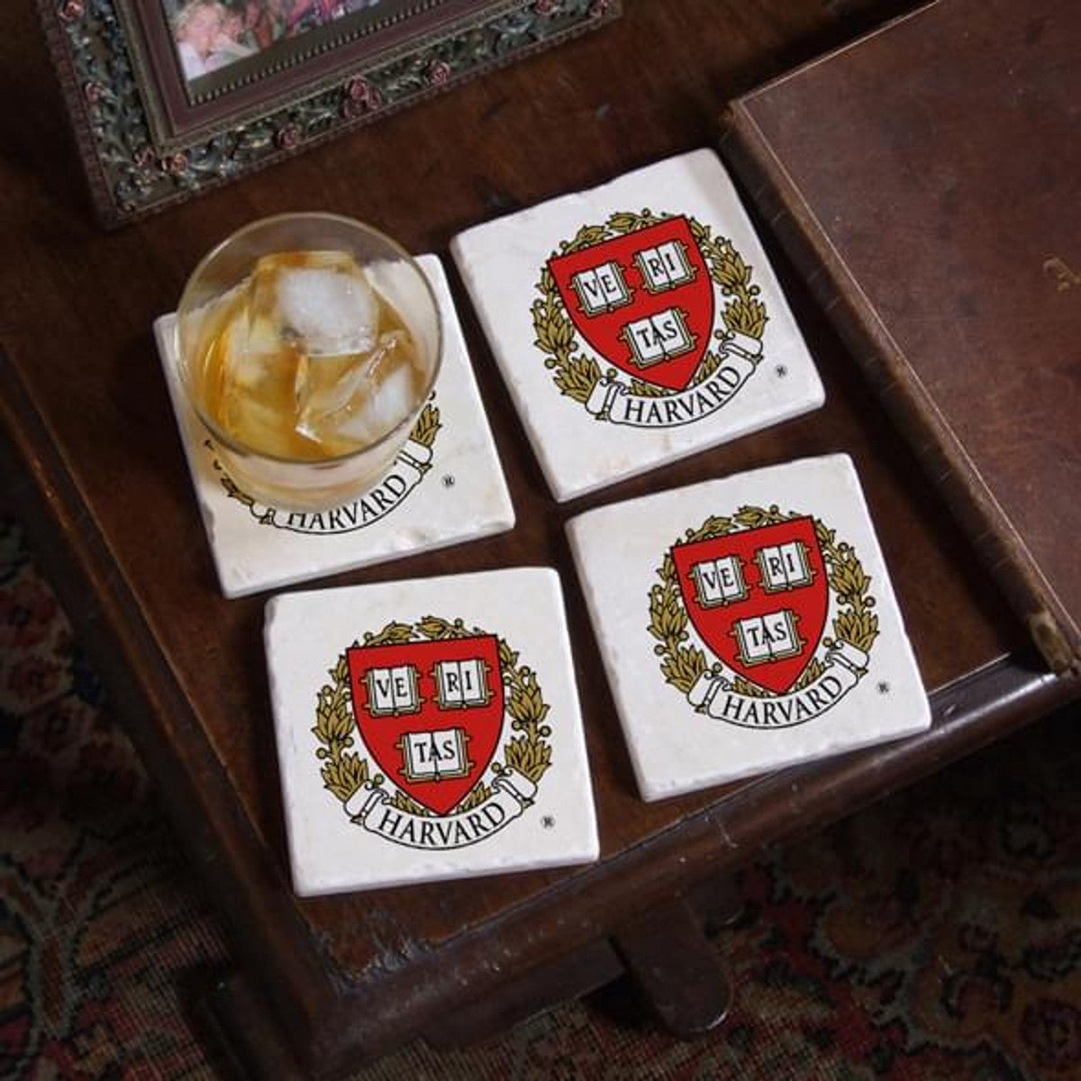 Handcrafted of Italian marble, our Harvard Crest coasters feature cork backing to protect your tabletop and prevent slipping.