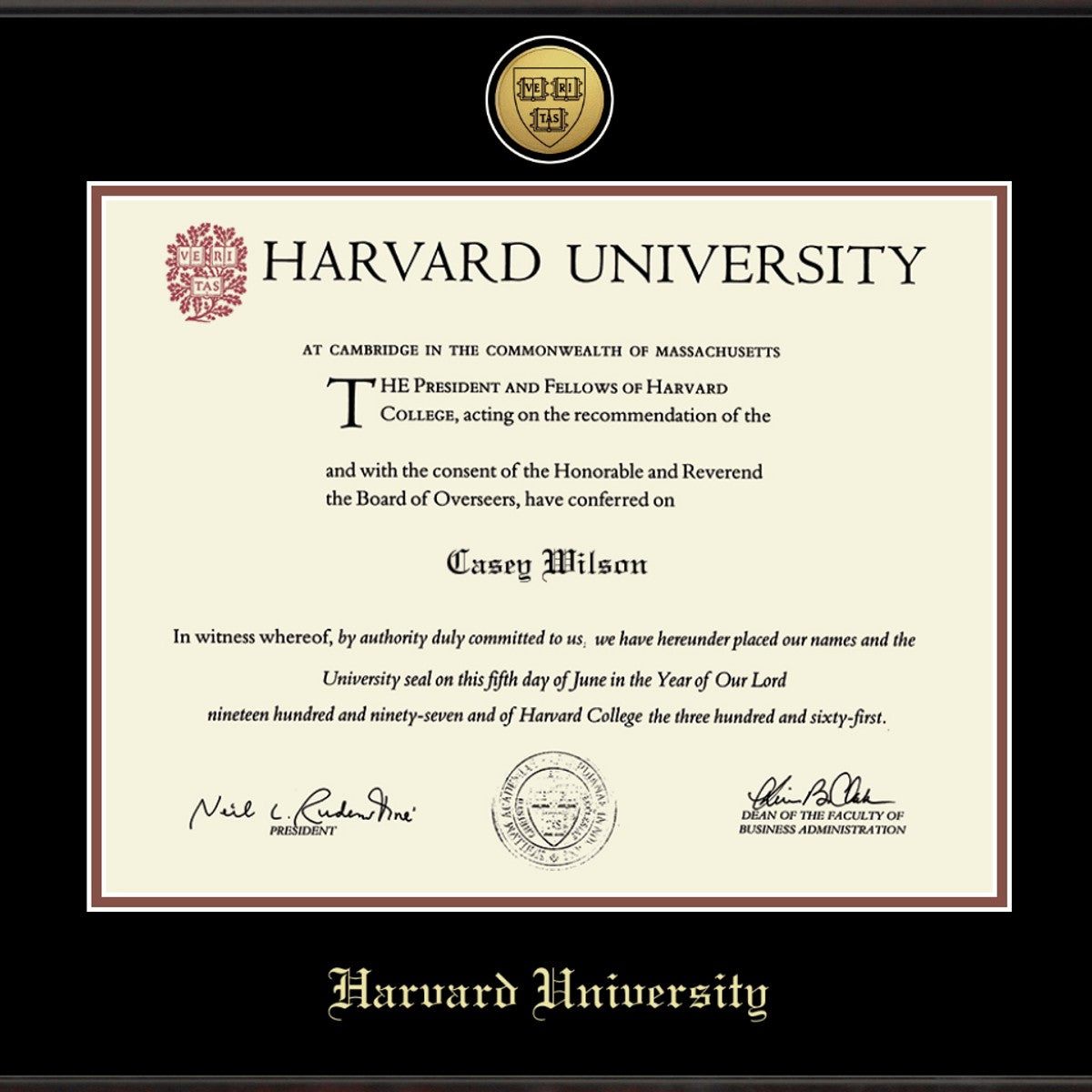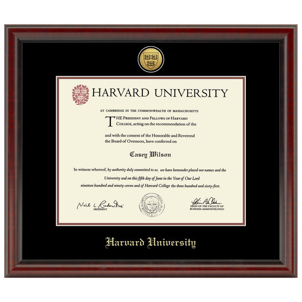 Highlighted by the gold medallion above the Harvard University diploma, this frame is sure to stand out in your home or office. Crafted in the USA of the finest hardwood with museum quality conservation mounting materials to showcase and protect your diploma.