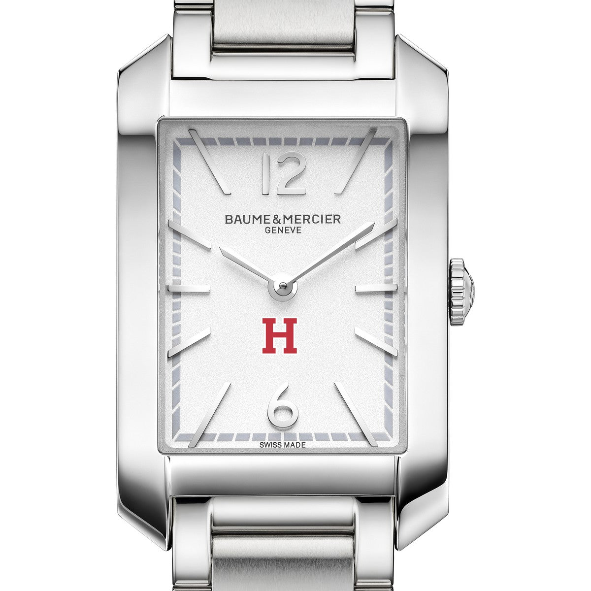 Sleek and sophisticated, the Harvard Women's Baume et Mercier Hampton Watch combines a silver opaline dial with the Harvard logo, rhodium-plated hands, and a polished stainless steel bracelet. A refined and elegant timepiece for those who appreciate timeless style. Complimentary personal engraving.