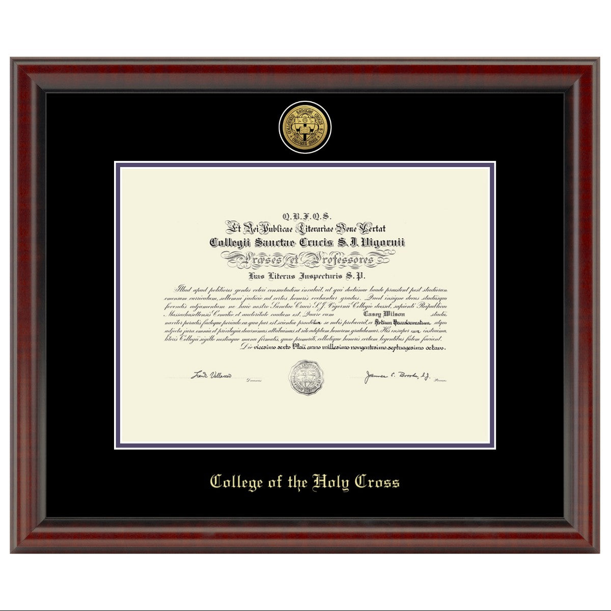 Highlighted by the gold medallion above the Holy Cross diploma, this frame is sure to stand out in your home or office. Crafted in the USA of the finest hardwood with museum quality conservation mounting materials to showcase and protect your diploma.