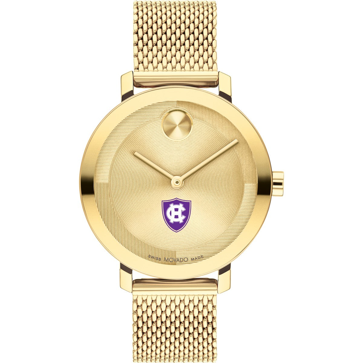 The Holy Cross Women's BOLD Movado features the prestigious Holy Cross Logo. Its pale gold Ionic-plated stainless steel mesh bracelet exudes contemporary elegance, making it a timeless accessory for the modern woman.