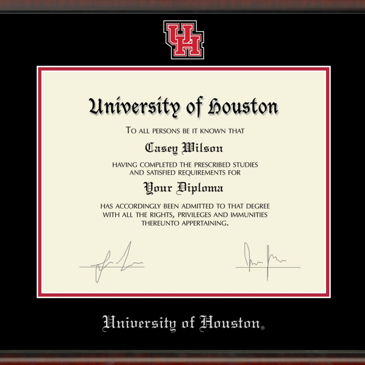 Highlighted by the custom minted seal above the University of Houston diploma, this frame is sure to stand out in your home or office. Crafted in the USA of the finest hardwood with museum quality conservation mounting materials to showcase and protect your diploma.