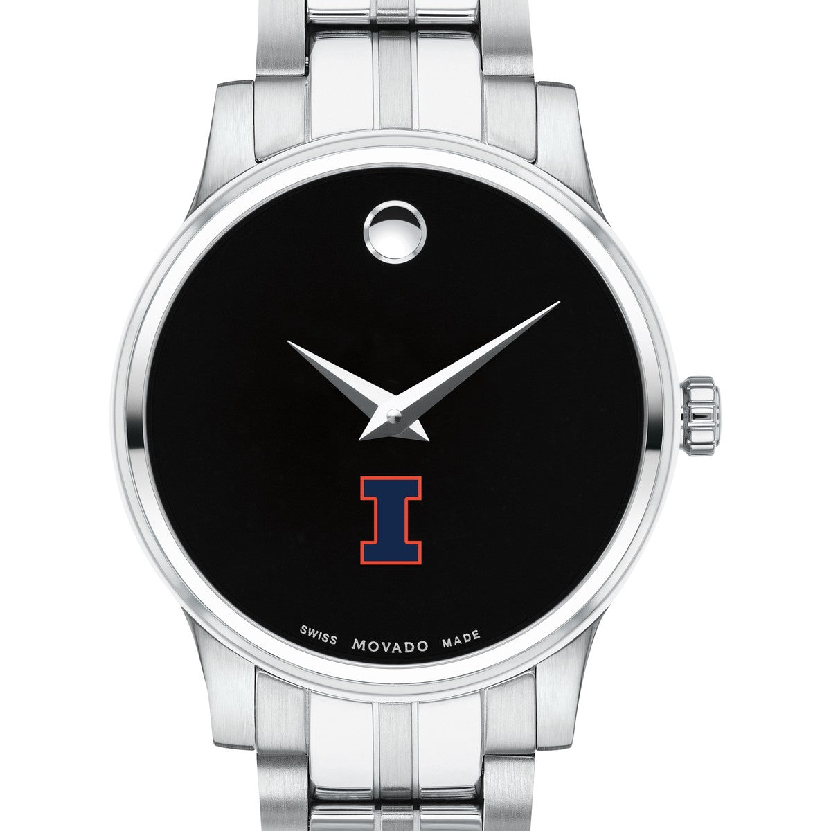 The University of Illinois Women's Movado Collection watch showcases the iconic Illinois Logo in full color against a sophisticated black dial. This elegant timepiece, featuring the renowned concave dot symbolizing the sun at high noon, embodies timeless style. Personalize your watch with free engraving without any delay to your order.