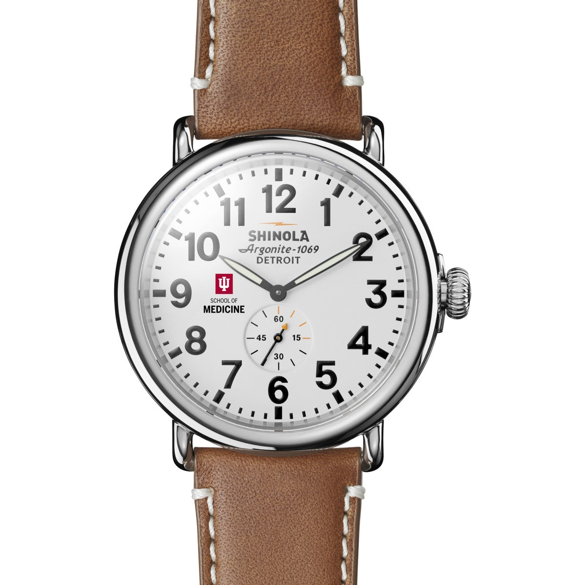 The Shinola Runwell features the IU School of Medicine logo in full color on the white dial with a large 47 mm case. Every detail of Shinola's flagship timepiece has been engineered with an obsessive focus to ensure it can be worn any way but it can't be worn out. Complimentary personal engraving