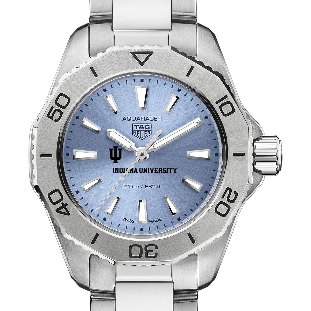 The Indiana University Women's TAG Heuer Steel Aquaracer with Blue Sunray Dial features the Indiana Logo on a stunning light blue sunray brushed dial. Complimentary personal engraving.