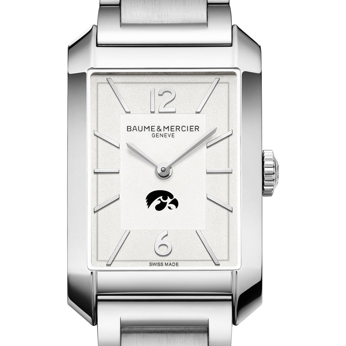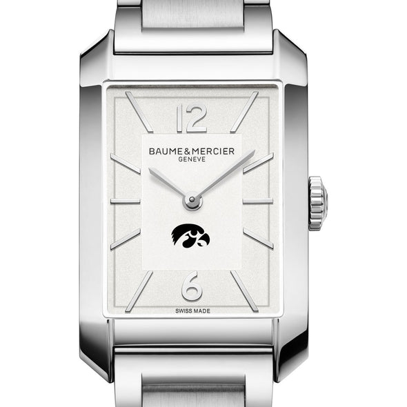 The Iowa Men's Baume et Mercier Hampton Watch combines contemporary design with timeless elegance. Its silver opaline dial, featuring the Iowa logo, rhodium-plated hands, and stainless steel bracelet make this rectangular timepiece a refined choice for any stylish man. Complimentary personal engraving.