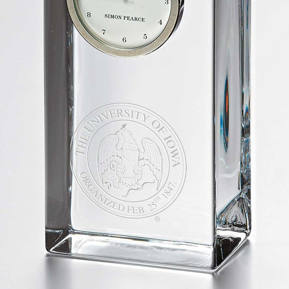 The Iowa Tall Glass Desk Clock stands proudly on any surface, distinctly etched with the University of Iowa logo. The clock showcases a traditional numbered face with a sweep hand to count the seconds.