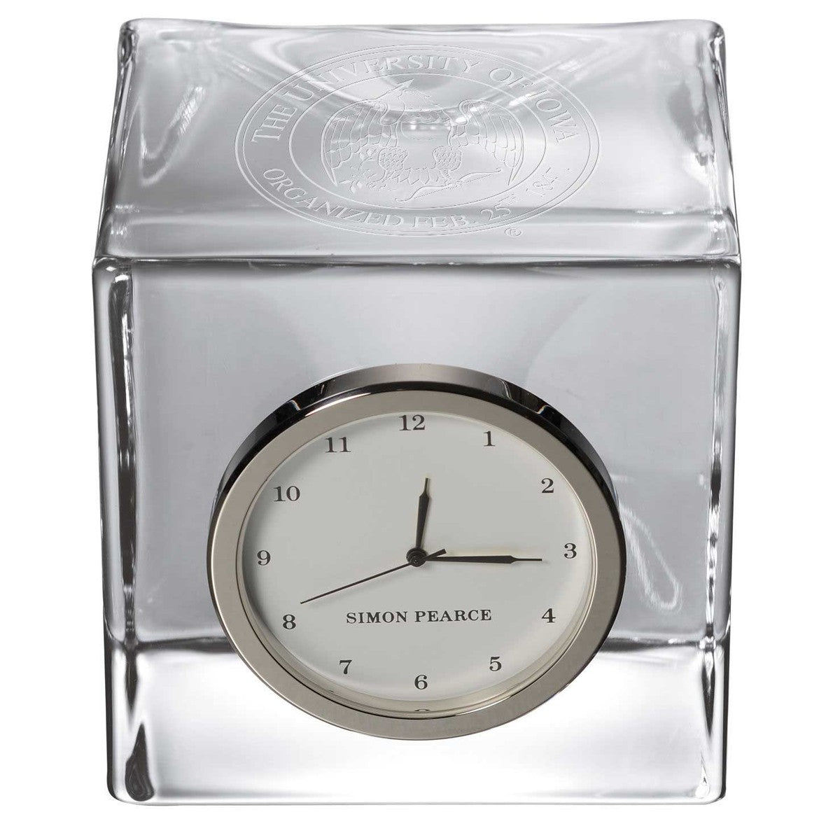 The University of Iowa Glass Desk Clock is distinctly etched with the University of Iowa logo, and is a great addition to any surface. The clock includes a traditional numbered face with a sweep hand to count the seconds.
