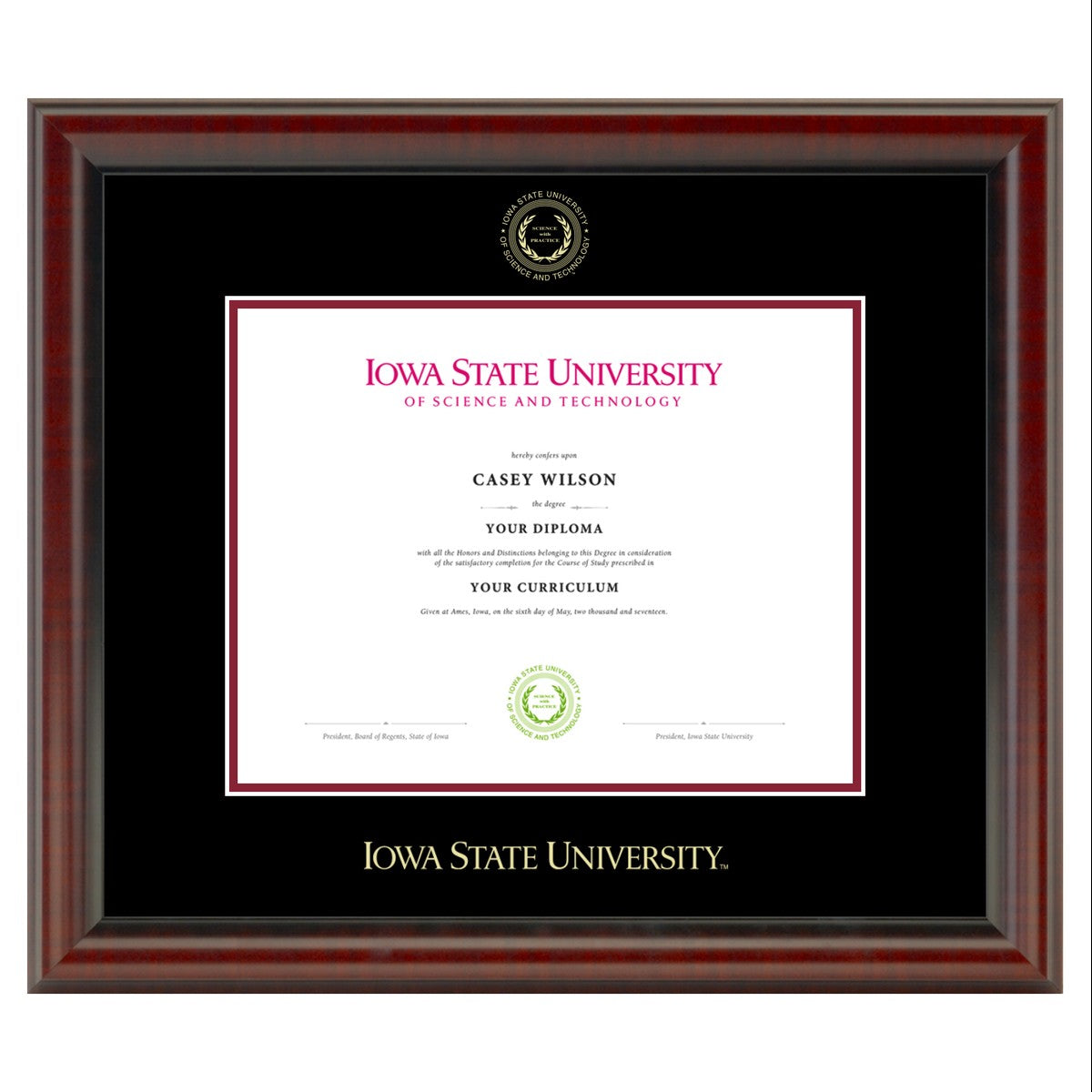 This Iowa State University Bachelors diploma frame is crafted from solid wood in the USA. Proudly display your Iowa State diploma with museum quality conservation mounting materials to showcase and protect your Iowa State University diploma.