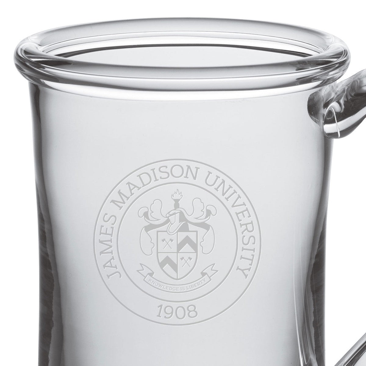 The James Madison Glass Tankard is an ideal choice if you're looking for a versatile glass. The enchantingly curved glass handle will help ensure that you don't spill a drop. The Glass Tankard has the James Madison Logo handsomely etched on the hand-blown glass.