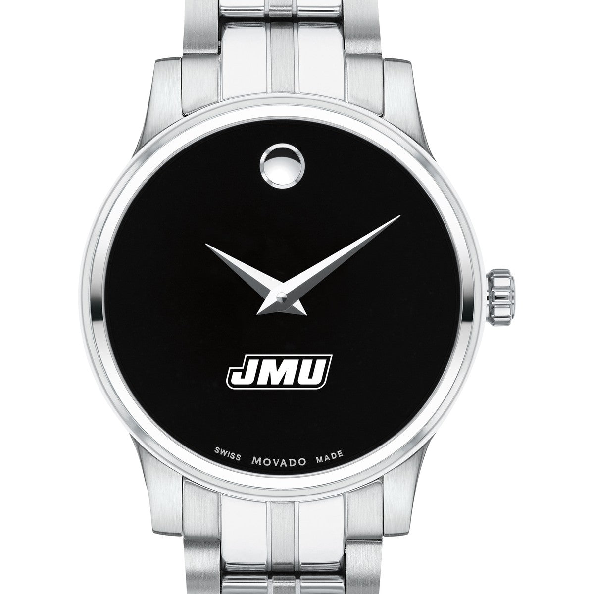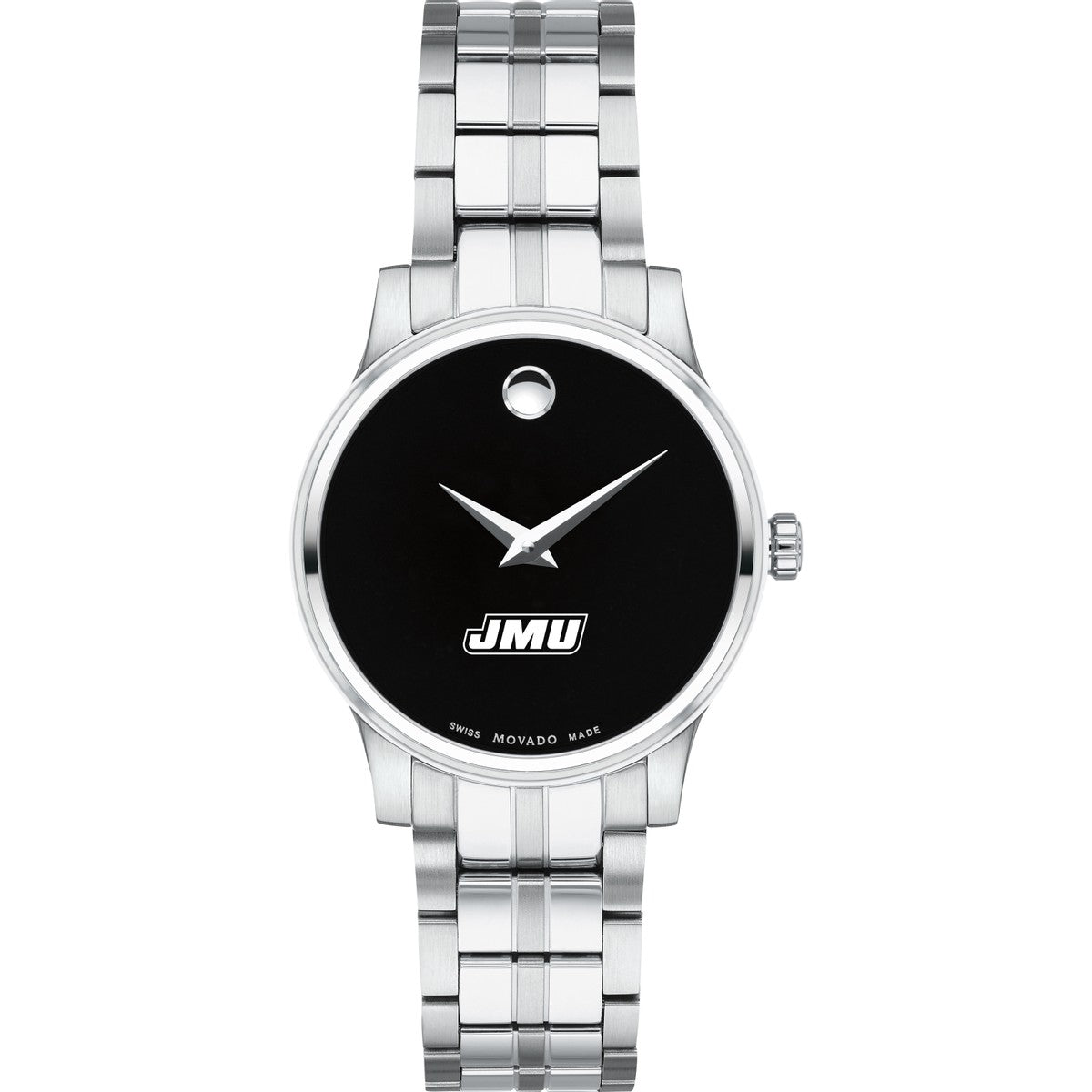 The James Madison University Women's Movado Collection watch showcases the iconic James Madison Logo in full color against a sophisticated black dial. This elegant timepiece, featuring the renowned concave dot symbolizing the sun at high noon, embodies timeless style. Personalize your watch with free engraving without any delay to your order.