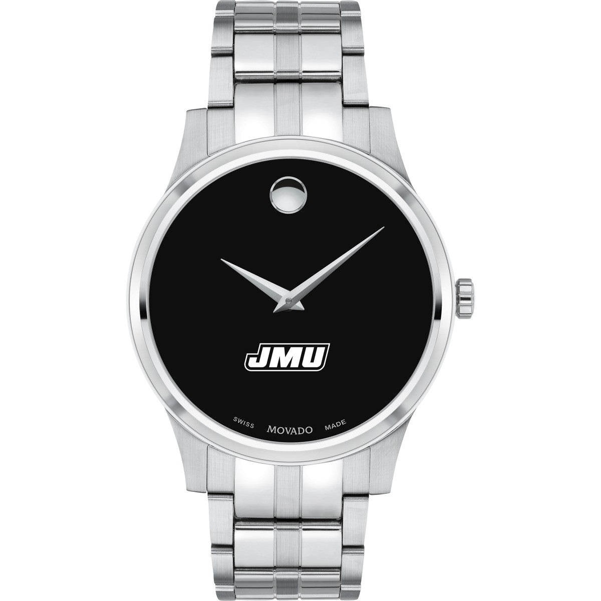 The James Madison University Men's Movado Collection watch showcases the iconic James Madison Logo in full color on a sophisticated black dial. This classic timepiece, featuring the renowned concave dot symbolizing the sun at high noon, has been a design masterpiece since its creation in 1947. Personalize your watch with free engraving without any delay to your order.