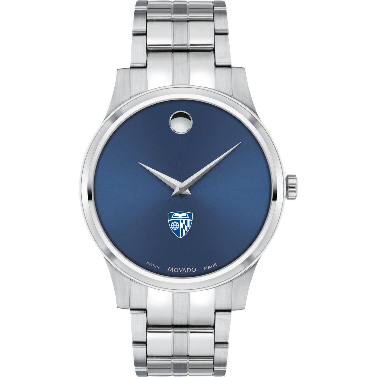The Johns Hopkins University Men's Movado Collection watch boasts a striking blue dial featuring the iconic Johns Hopkins Logo in full color. This timeless timepiece, renowned for its concave dot representing the sun at high noon, has been a symbol of elegance since its inception in 1947. Make it uniquely yours with free engraving without affecting order processing time.