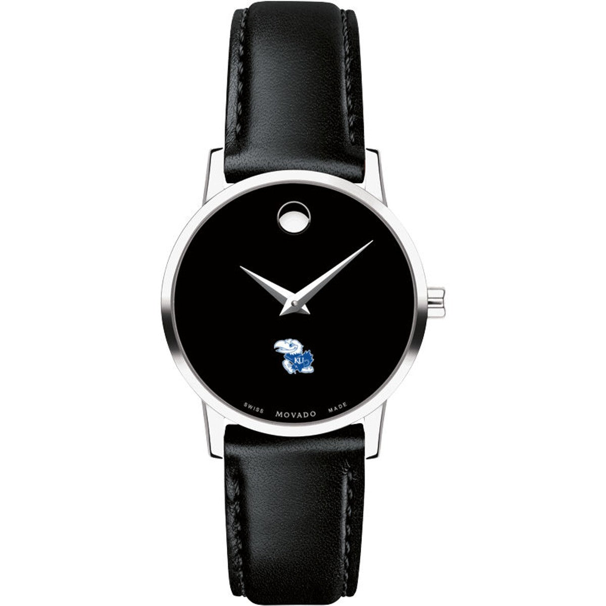 University of Kansas Women's Movado Museum watch features the Kansas logo in full color at 6 o'clock on black dial. Created in 1947, the iconic concave dot symbolizes the sun at high-noon. Complimentary personal engraving.