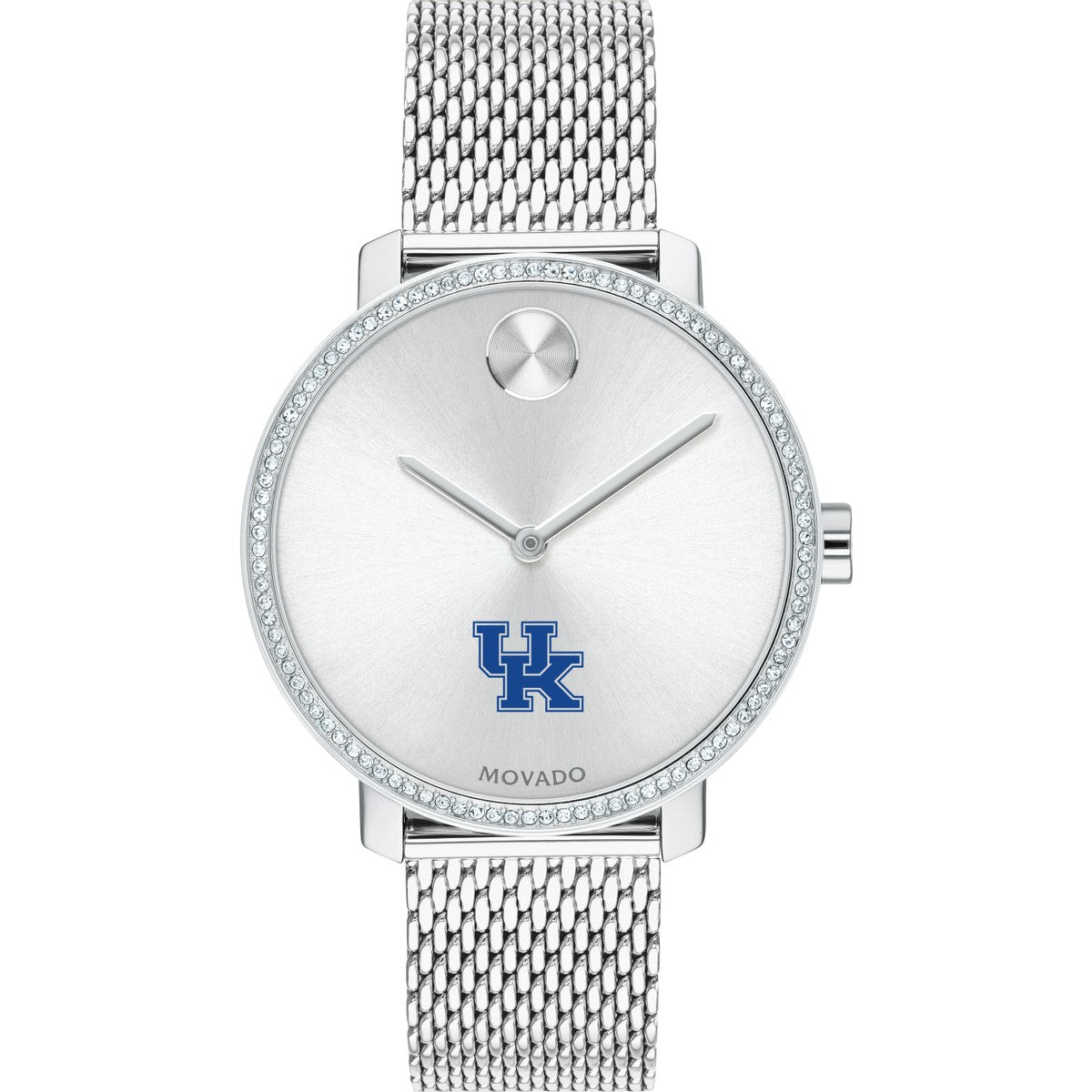 University of Kentucky Women's Movado BOLD watch features the Kentucky Logo in full color at 6 o'clock on silver sunray dial.