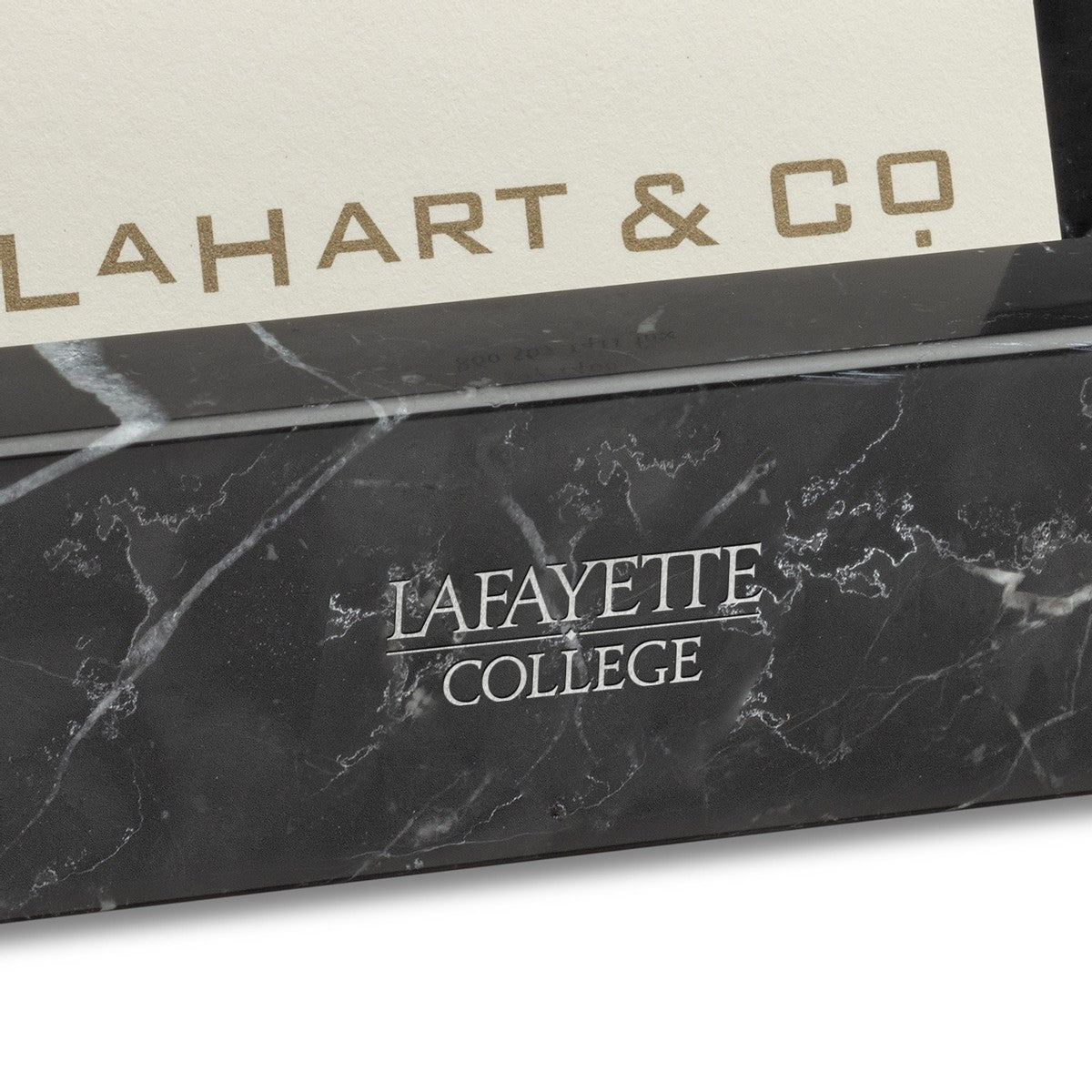 Perfect for new grads and seasoned professionals, the officially licensed Lafayette College marble cardholder is an essential for the desk of Lafayette fans. The Lafayette Logo is elegantly featured on the front of this substantial, solid marble card holder and accommodates all standard size business cards.