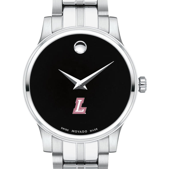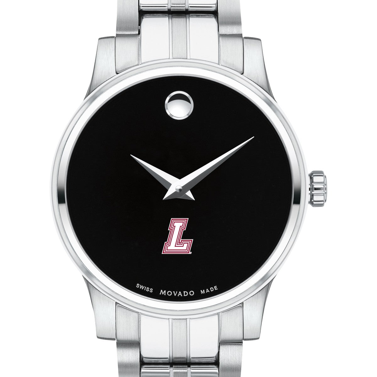 The Lafayette College Women's Movado Collection watch showcases the iconic Lafayette Logo in full color against a sophisticated black dial. This elegant timepiece, featuring the renowned concave dot symbolizing the sun at high noon, embodies timeless style. Personalize your watch with free engraving without any delay to your order.