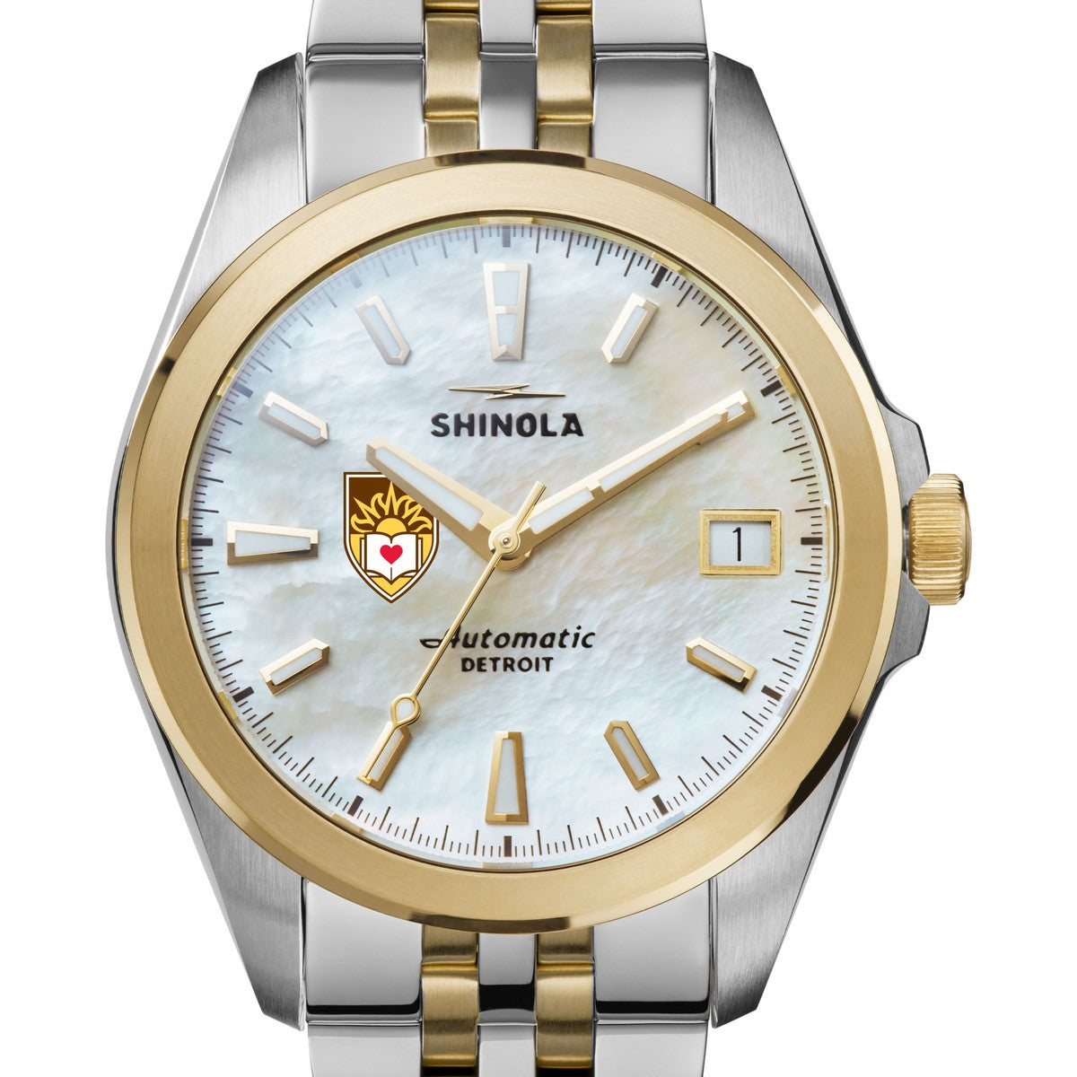 - Mother-of-pearl dial features gold PVD Arabic numeral indices, a calendar aperture, and Super-LumiNova on the markers and hands