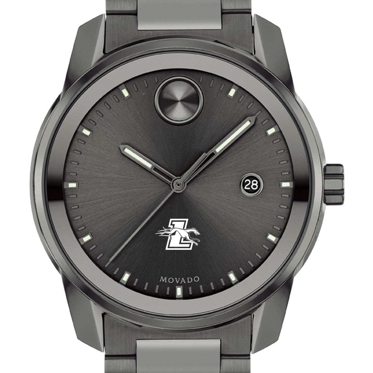 Loyola University Men's Movado BOLD Gunmetal Grey with Date Window features high-tech materials, bold signature dot, and the sophistication of Movado with the Loyola logo. Complimentary personal engraving.