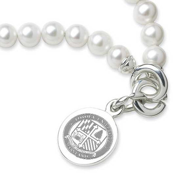 Loyola University pearl bracelet and sterling silver Loyola charm features the Loyola logo delicately engraved on front and interlocking "C" clasp.