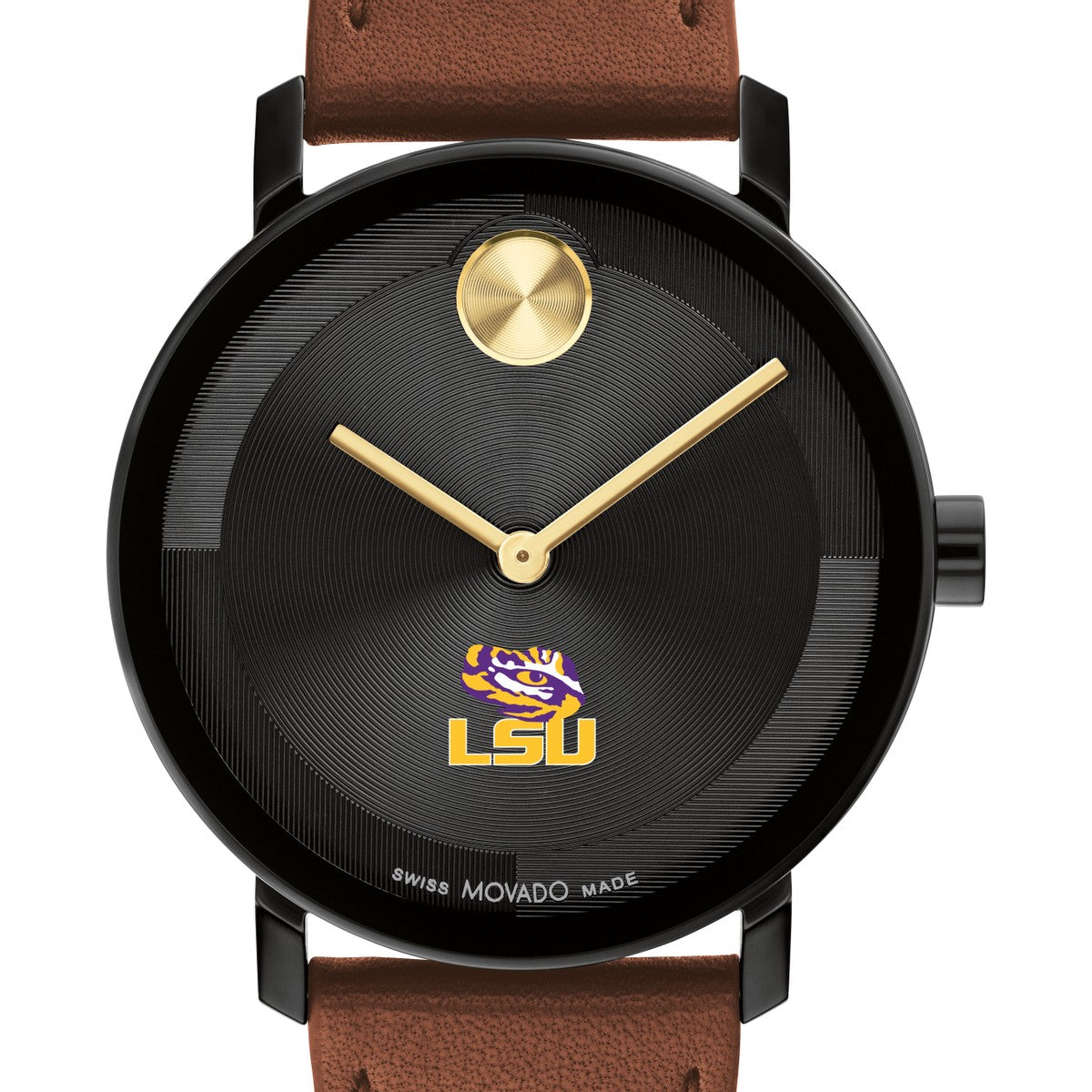 Embrace timeless sophistication with the Louisiana State University Men's Movado watch, featuring LSU Logo on the dial. Crafted with a luxurious Cognac Nappa leather strap and a striking micro-textured black tonal dial with a glossy lacquer overlay. Complimentary personal engraving.