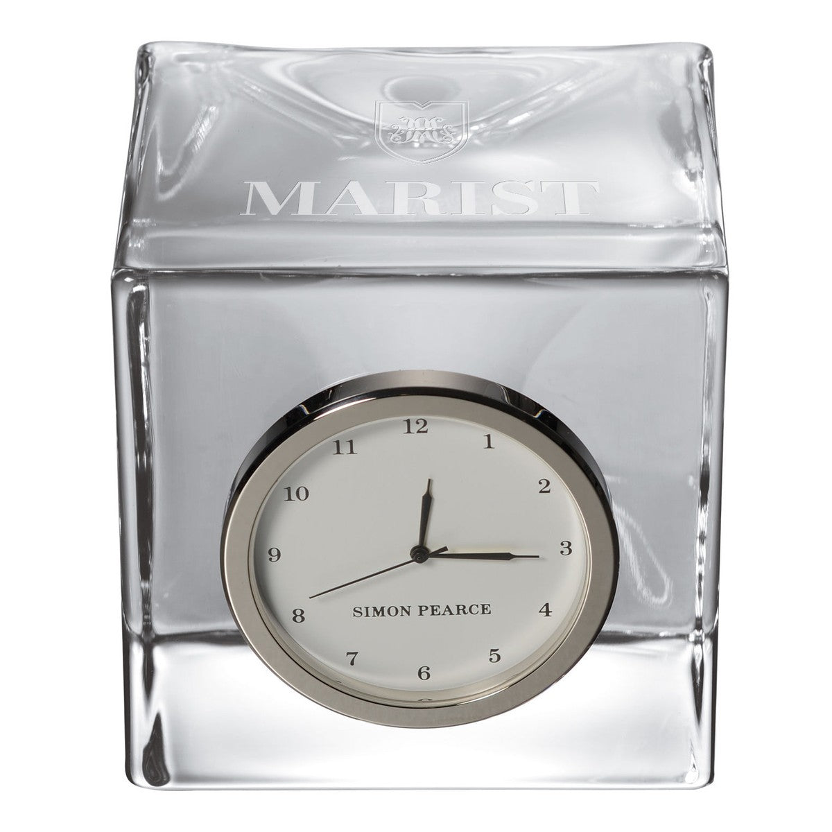 The Marist University Glass Desk Clock is distinctly etched with the Marist Logo, and is a great addition to any surface. The clock includes a traditional numbered face with a sweep hand to count the seconds.