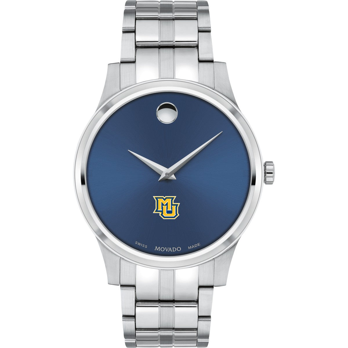 The Marquette Men's Movado Collection watch boasts a striking blue dial featuring the iconic Marquette Logo in full color. This timeless timepiece, renowned for its concave dot representing the sun at high noon, has been a symbol of elegance since its inception in 1947. Make it uniquely yours with free engraving without affecting order processing time.