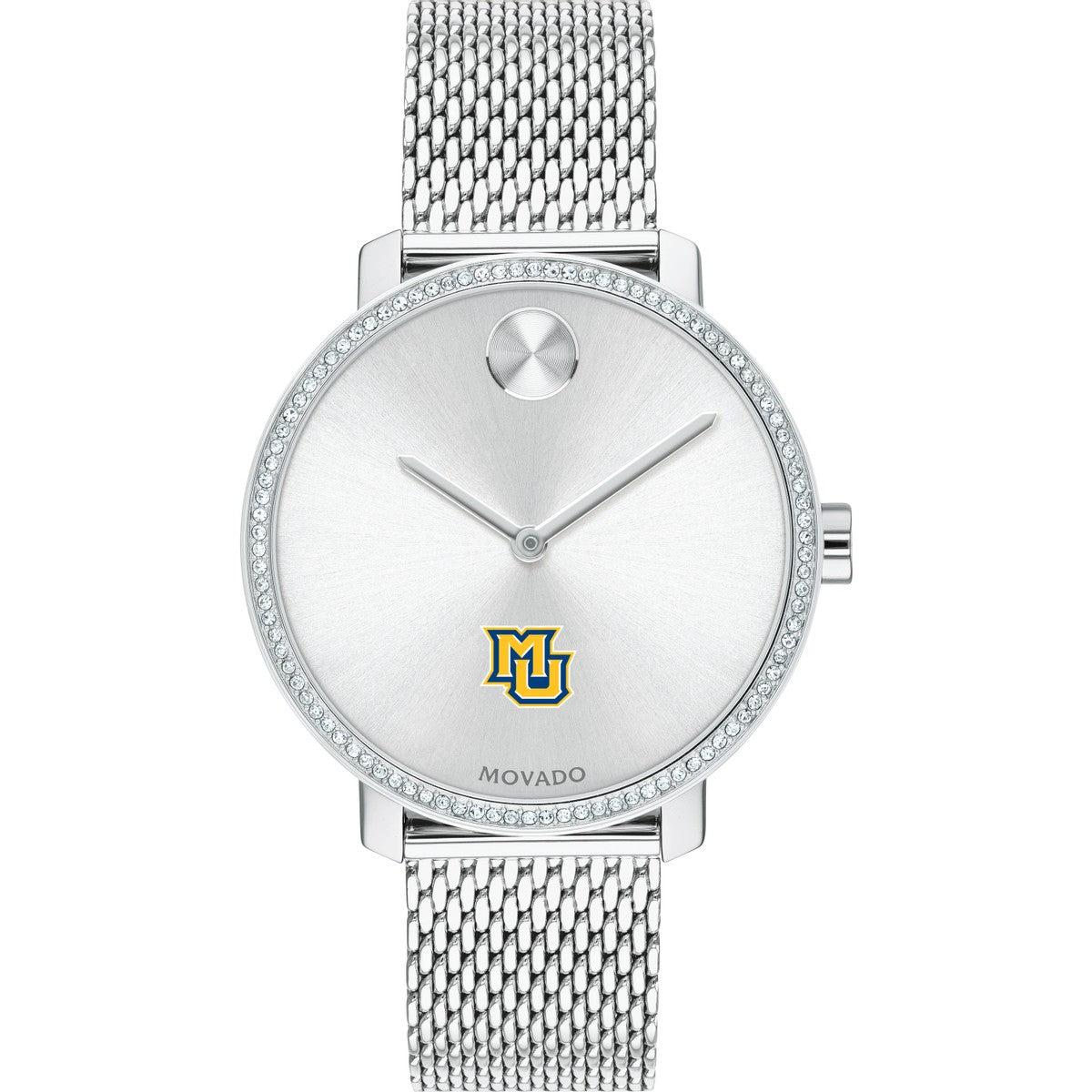 Marquette Women's Movado BOLD watch features the Marquette Logo in full color at 6 o'clock on silver sunray dial.