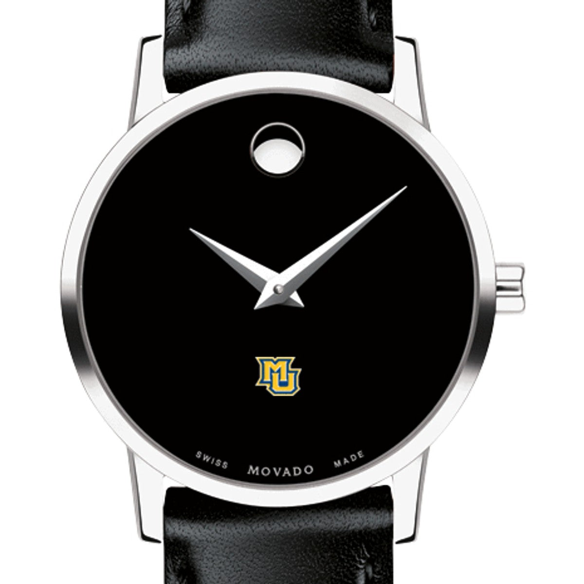 Marquette Women's Movado Museum watch features the Marquette Logo in full color at 6 o'clock on black dial. Created in 1947, the iconic concave dot symbolizes the sun at high-noon. Complimentary personal engraving.