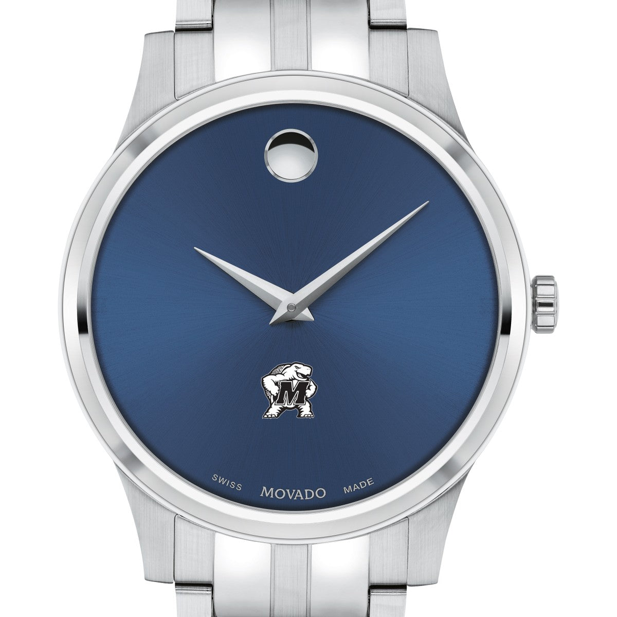 The University of Maryland Men's Movado Collection watch boasts a striking blue dial featuring the iconic Maryland Logo in full color. This timeless timepiece, renowned for its concave dot representing the sun at high noon, has been a symbol of elegance since its inception in 1947. Make it uniquely yours with free engraving without affecting order processing time.