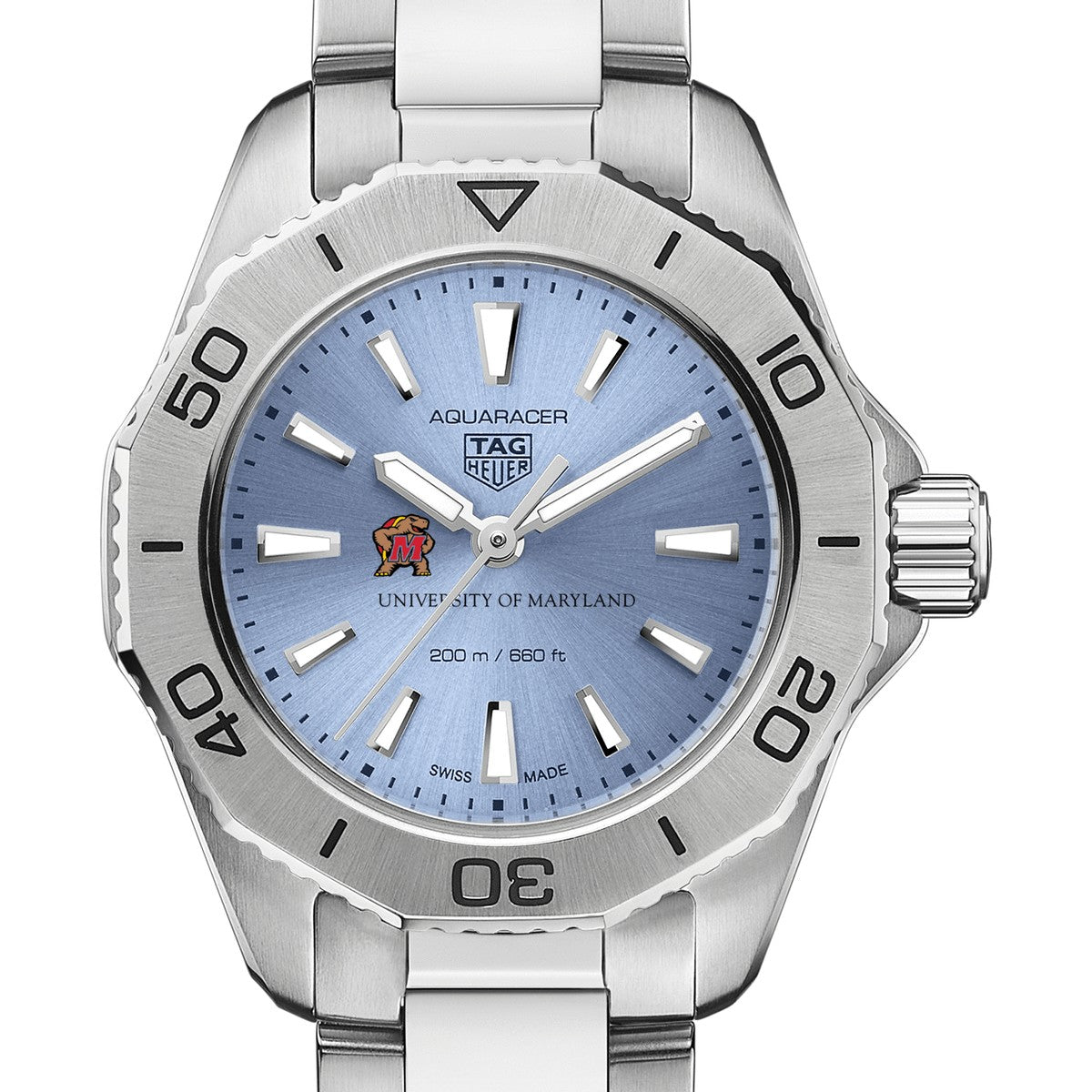 The University of Maryland Women's TAG Heuer Steel Aquaracer with Blue Sunray Dial features the Maryland Logo on a stunning light blue sunray brushed dial. Complimentary personal engraving.
