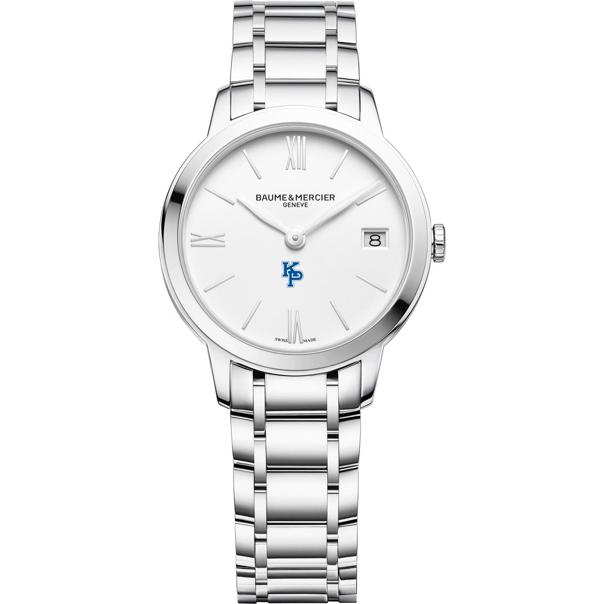 Timeless beauty defines the USMMA Women's Baume et Mercier 31mm Classima Watch, featuring a white matte dial with the USMMA logo, luminous rhodium-plated hands, and a polished steel bracelet. A sophisticated timepiece to complement any ensemble with grace. Complimentary personal engraving.